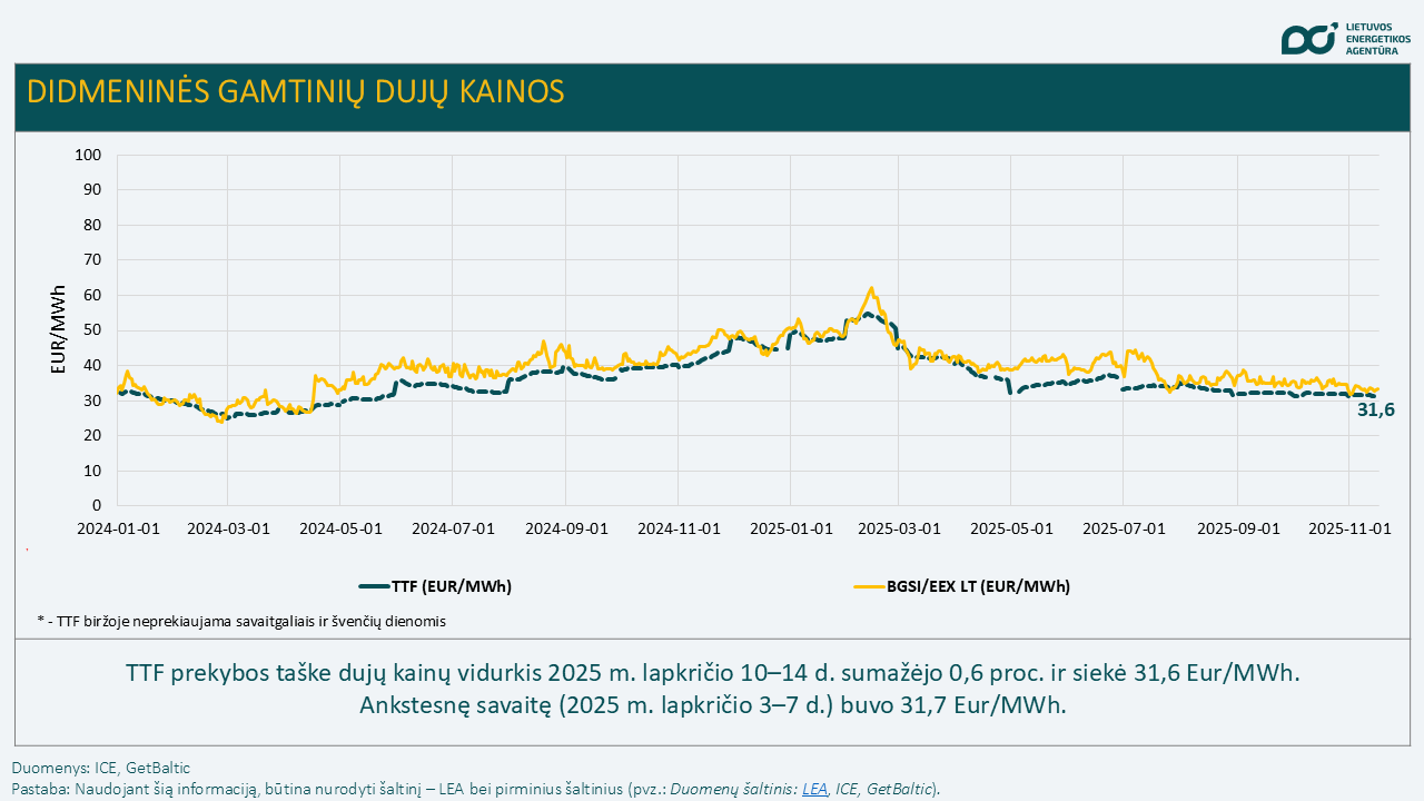 Didmeninė vidutinė dujų kaina Nyderlandų prekybos taške TTF per savaitę sumažėjo 0,6 proc. – kainų vidurkis lapkričio 10–14 d. sudarė 31,6 Eur/MWh. Ankstesnę savaitę buvo 31,7 Eur/MWh. Gamtinių dujų kainų mažėjimą ir toliau lėmė vidutinė gamtinių dujų paklausa, sutapusi su pakankama SGD bei gamtinių dujų, importuojamų vamzdynais, pasiūla.