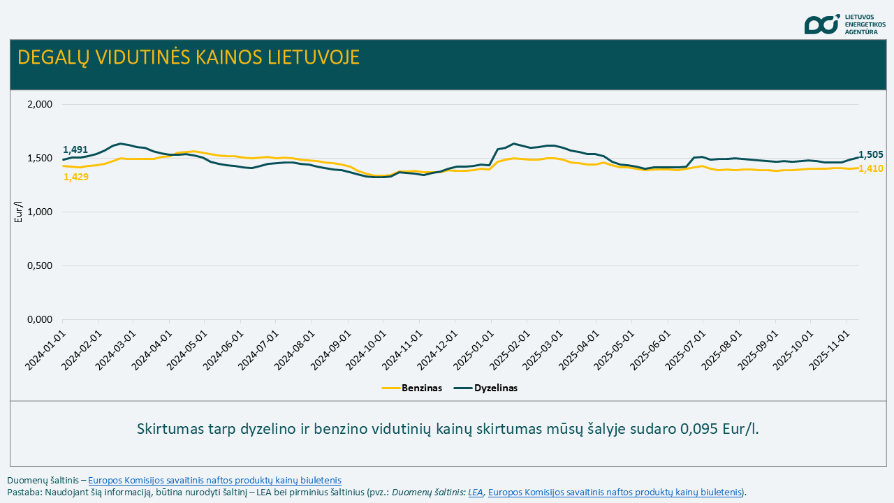 Tarp Baltijos šalių benzinas yra pigiausias Lietuvoje, o dyzelinas – Estijoje. Skirtumas tarp dyzelino ir benzino vidutinių kainų mūsų šalyje padidėjo ir sudaro 0,095 Eur/l. Palyginti su ES šalių degalų kainų svertiniais vidurkiais, Lietuvoje benzino vidutinė kaina mažesnė 13,6 proc., o dyzelino – 4,1 proc. mažesnė.