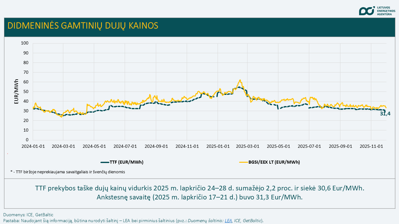 Didmeninė vidutinė dujų kaina Nyderlandų prekybos taške TTF per savaitę sumažėjo 2,2 proc. – kainų vidurkis lapkričio 24–28 d. sudarė 30,6 Eur/MWh. Ankstesnę savaitę buvo 31,3 Eur/MWh. Gamtinių dujų kainų mažėjimą lėmė stabilus suskystintų gamtinių dujų tiekimas į Europą.