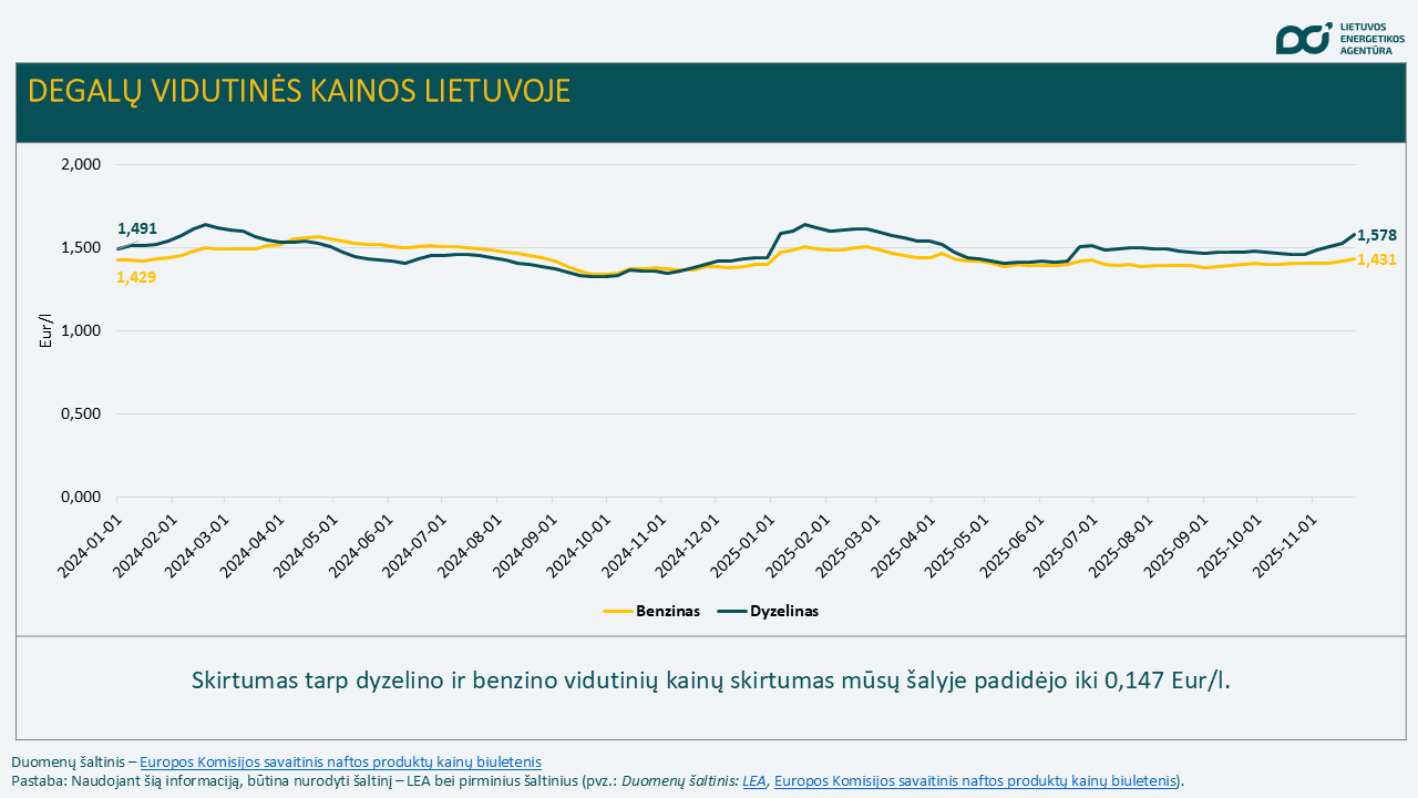 2025 m. lapkričio 24 d., palyginti su lapkričio 17 d., benzino vidutinės kainos Lietuvoje, Latvijoje ir Estijoje padidėjo 0,7–2,4 proc., Lenkijoje ir Vokietijoje sumažėjo atitinkamai 0,7 proc. ir 0,5 procento. Nagrinėjamu laikotarpiu dyzelino vidutinės kainos visose lyginamose šalyse padidėjo 1,2–3,5 procento.