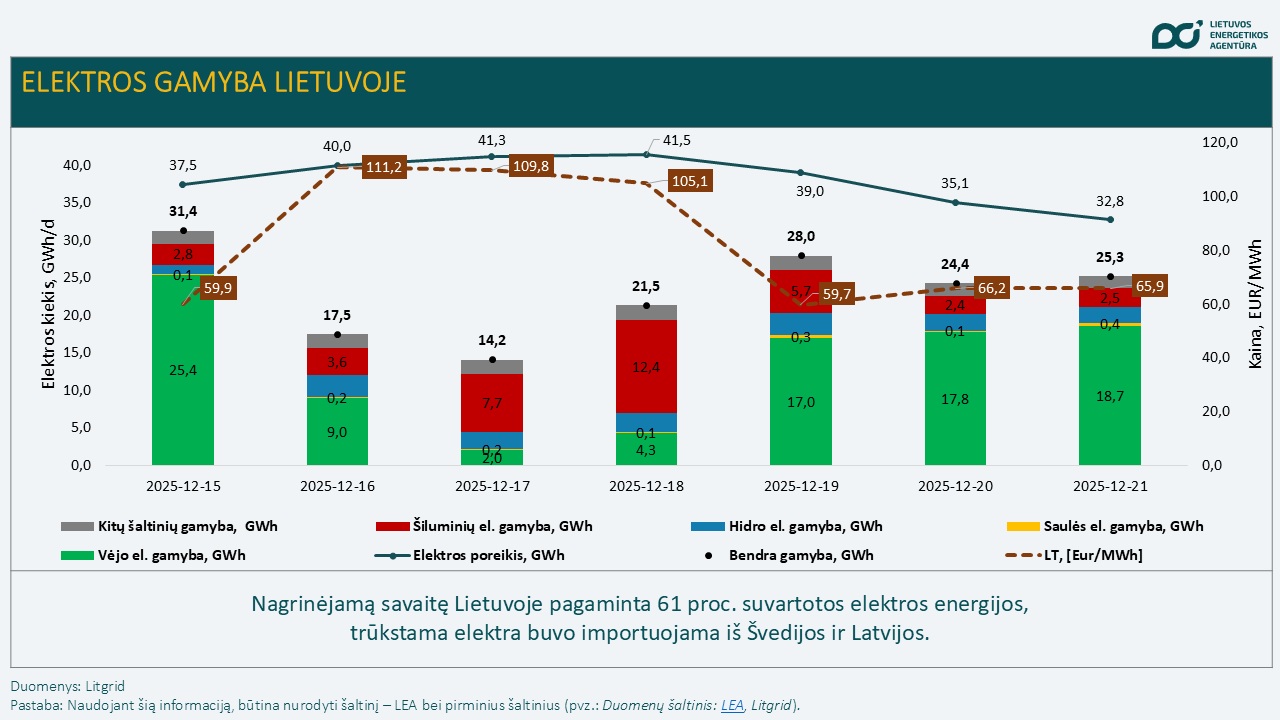 Bendra elektros gamyba Lietuvoje praėjusią savaitę siekė 162,2 GWh, arba 16,3 proc. mažiau, palyginti su ankstesne savaite. Per savaitę šalyje pasigaminome apie 61 proc. suvartotos elektros energijos, trūkstama elektra buvo importuojama iš Švedijos ir Latvijos. Dėl remonto darbų Švedijoje nuo penktadienio iki šeštadienio jungtis „Nord Balt“ buvo išjungta.