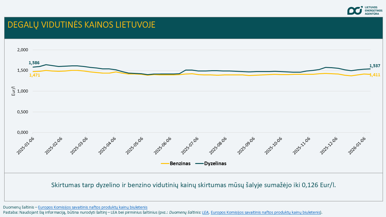2026 01 19Dėl įsivyravusių šaltų orų didėjant energijos vartojimui, praėjusią savaitę, sausio 12–18 dienomis, brango beveik visi energijos ištekliai: didmeninė elektros energijos kaina Lietuvoje padidėjo 7 proc., sausio 13 d. pasiektas paros elektros energijos vartojimo rekordas – apie 51,4 GWh. Tą dieną didmeninė elektros energijos kaina Lietuvoje siekė 238,3 Eur/MWh – daugiausiai šiemet. Gamtinių dujų kaina TTF per savaitę padidėjo 3,4 proc., biokuras mūsų šalyje pabrango 3,9 proc., o Brent naftos kainų vidurkis dėl neramumų Irane brango 5,2 proc., mūsų šalyje dyzelino kaina pakilo 0,4 proc., o benzinas atpigo 0,4 procento.