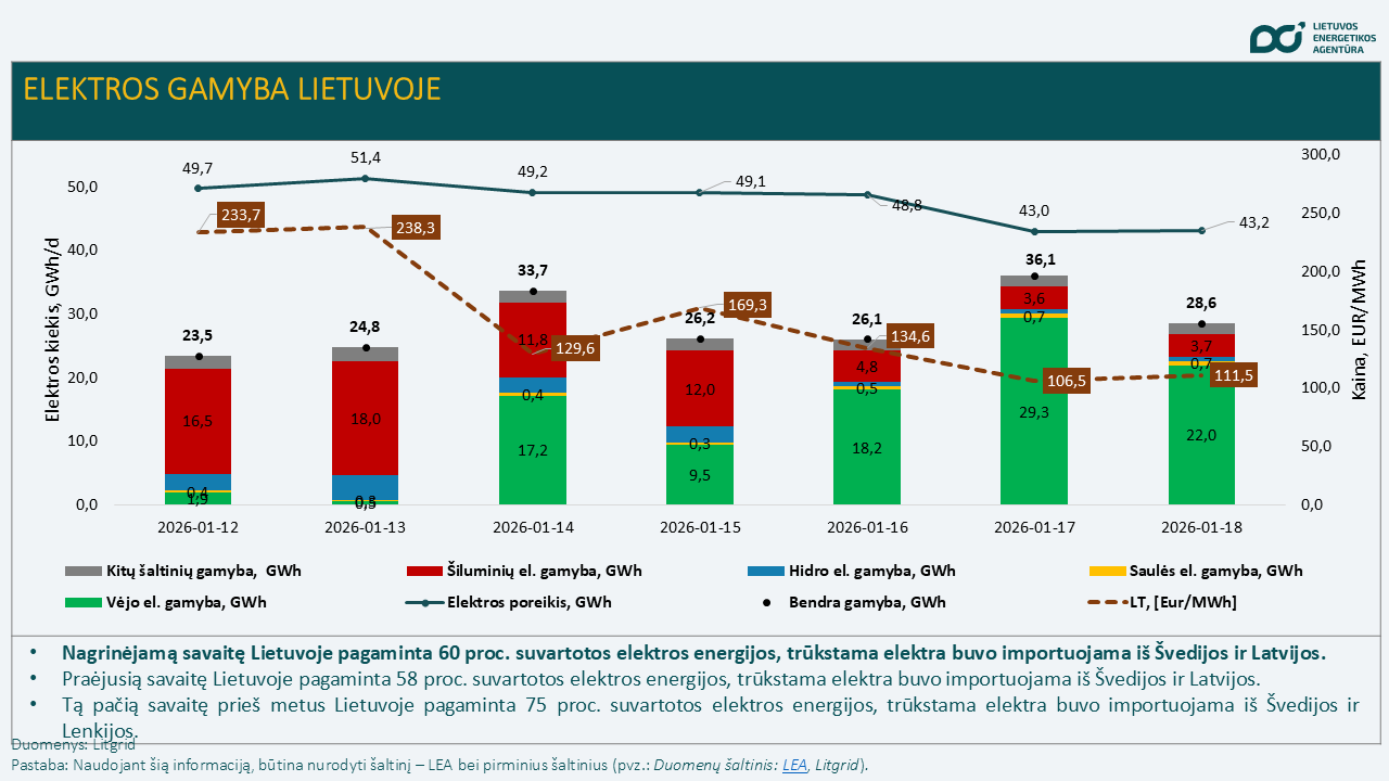 Bendra elektros gamyba Lietuvoje praėjusią savaitę siekė 199,1 GWh, arba 20,4 proc. daugiau, palyginti su ankstesne savaite. Per savaitę šalyje pasigaminome apie 60 proc. suvartotos elektros energijos, trūkstama elektra buvo importuojama iš Švedijos ir Latvijos. Palyginimui, praėjusią savaitę Lietuvoje pagaminta 58 proc. suvartotos elektros energijos, trūkstama elektra buvo importuojama iš Švedijos ir Latvijos.