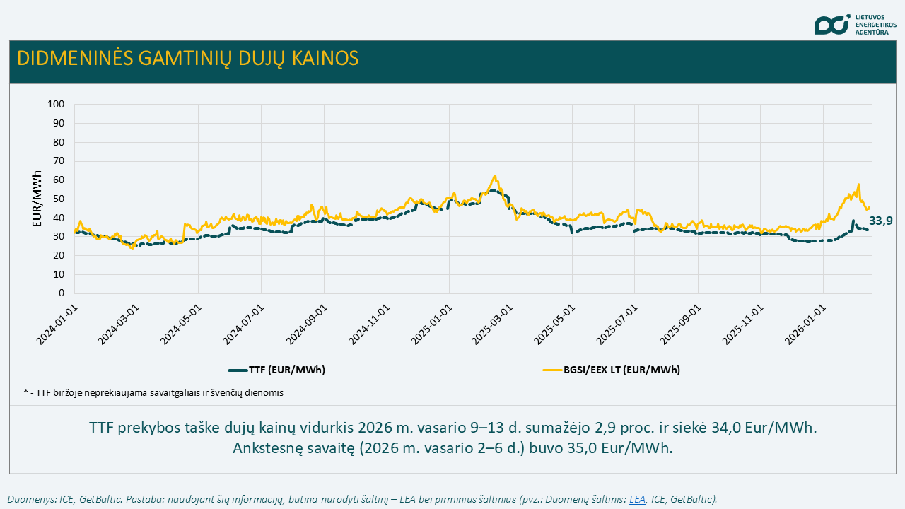 Per savaitę vidutinė didmeninė dujų kaina Nyderlandų prekybos taške TTF sumažėjo 2,9 proc. – kainų vidurkis vasario 9–13 d. sudarė 34 Eur/MWh. Ankstesnę savaitę buvo 35 Eur/MWh. Gamtinių dujų kainų sumažėjimą lėmė prognozuojami švelnesni orai Europoje.