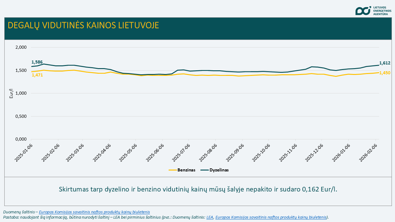 2026 02 16Praėjusią savaitę trumpam atšilus orams, sumažėjo ir energijos išteklių vartojimas, o tai atspindėjo kainų dinamika: elektros kainos Lietuvoje mažėjo 22 proc., gamtinių dujų TTF kainos smuktelėjo 2,9 procento. Dujų suvartojimas, palyginti su ankstesne savaite, sumažėjo 23,3 proc., o elektros energijos vartojimas mažėjo 2,7 proc., bet tebėra 20,3 proc. didesnis nei pernai tą pačią savaitę. Dėl silpno vėjo ir saulės potencialo, Lietuvoje pasigaminta apie 52 proc. visos suvartotos elektros energijos, bet palyginus su ta pačia savaite pernai, elektros gamyba šiemet yra 16,3 proc. didesnė. Brent naftos kainos dėl išliekančios įtampos tarp JAV ir Irano pasaulinėse rinkose augo 1,2 proc., o Lietuvoje neženkliai brango degalų benzinas ir dyzelinas – iki 1 procento. Išliekanti stora sniego danga miškuose turėjo įtakos biokuro brangimui – per savaitę jo pakainos kilo 9,8 proc. ir peržengė 40 Eur/MWh – tiek biokuras Lietuvoje pastarąjį kartą kainavo 2022 m. spalio mėnesį.