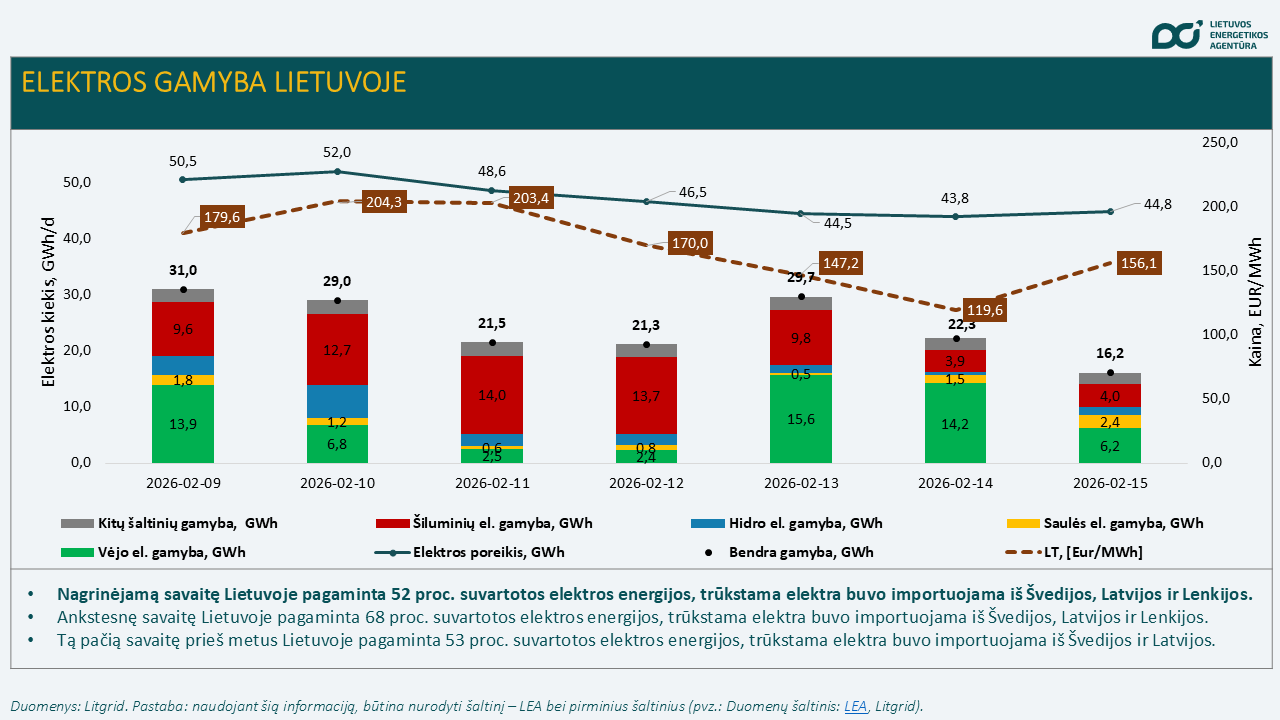 Vasario 9–15 d. bendra elektros gamyba Lietuvoje, palyginti su ankstesne savaite (230,2 GWh), sumažėjo 25,7 proc. ir siekė 171 GWh. Lietuvoje pasigaminta apie 52 proc. visos suvartotos elektros energijos, ankstesnę savaitę – 68 procentai.