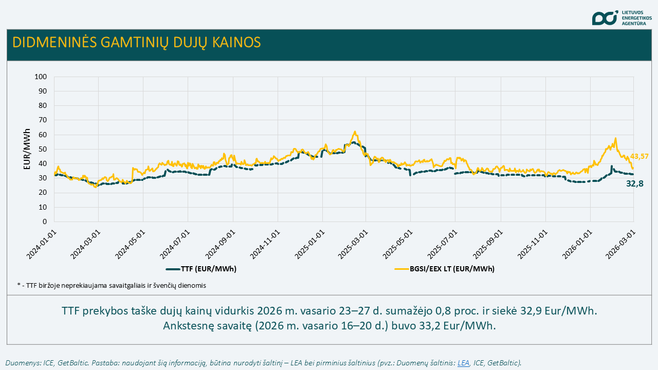 Vidutinė didmeninė dujų kaina Nyderlandų prekybos taške TTF per savaitę sumažėjo, kainų vidurkis vasario 23–27 d. sudarė 32,9 Eur/MWh. Ankstesnę savaitę buvo 33,2 Eur/MWh. Gamtinių dujų kainų mažėjimui praėjusią savaitę įtakos turėjo Europoje įsivyravę švelnesni orai, tačiau savaitgalį prasidėję įvykiai Irane kelia grėsmę pasauliniam SGD tiekimui per Hormūzo sąsiaurį, o tai būtų pagrindinis veiksnys gamtinių dujų kainų kilimu artimuoju laikotarpiu.