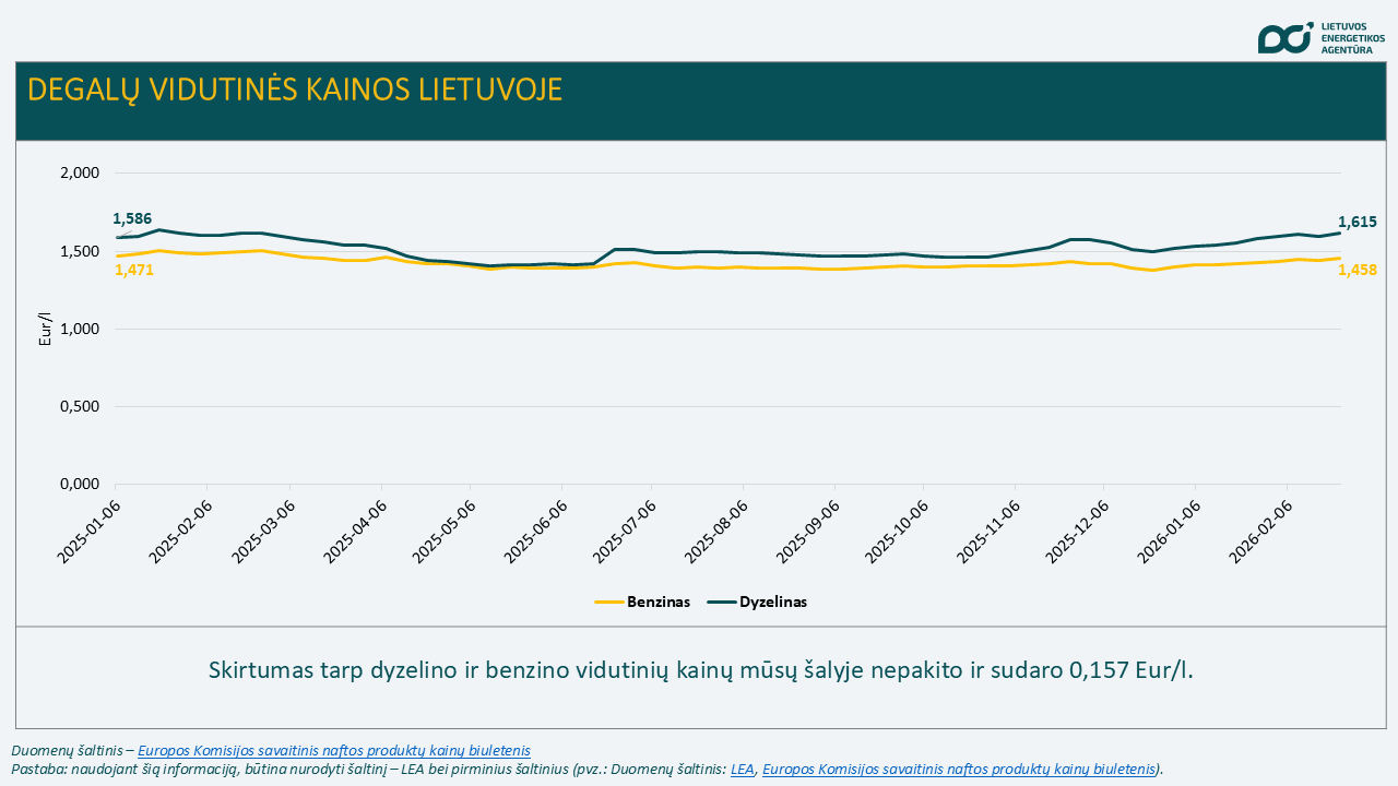 Tarp Baltijos šalių benzinas ir dyzelinas pigiausi yra Estijoje. Skirtumas tarp dyzelino ir benzino vidutinių kainų mūsų šalyje nepakito ir sudaro 0,157 Eur/l. Palyginti su ES šalių degalų kainų svertiniais vidurkiais, Lietuvoje benzino vidutinė kaina mažesnė 11 proc., o dyzelino – 1,3 proc. didesnė.