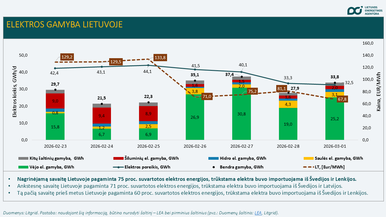 Bendra elektros gamyba per savaitę Lietuvoje, palyginti su ankstesne savaite (220,8 GWh), sumažėjo 5,9 proc. ir siekė 207,8 GWh. Šalyje pasigaminta apie 75 proc. visos suvartotos elektros energijos, ankstesnę savaitę – 71 procentas.
