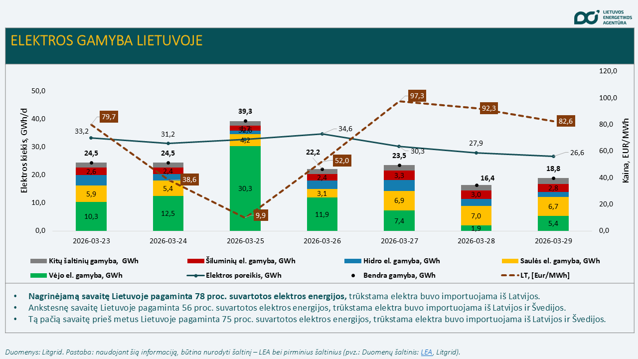 Bendra elektros gamyba per savaitę Lietuvoje, palyginti su ankstesne savaite (123,6 GWh), padidėjo 36,8 proc. ir siekė 169,1 GWh. Šalyje pasigaminta apie 78 proc. visos suvartotos elektros energijos, ankstesnę savaitę – 56 procentai.