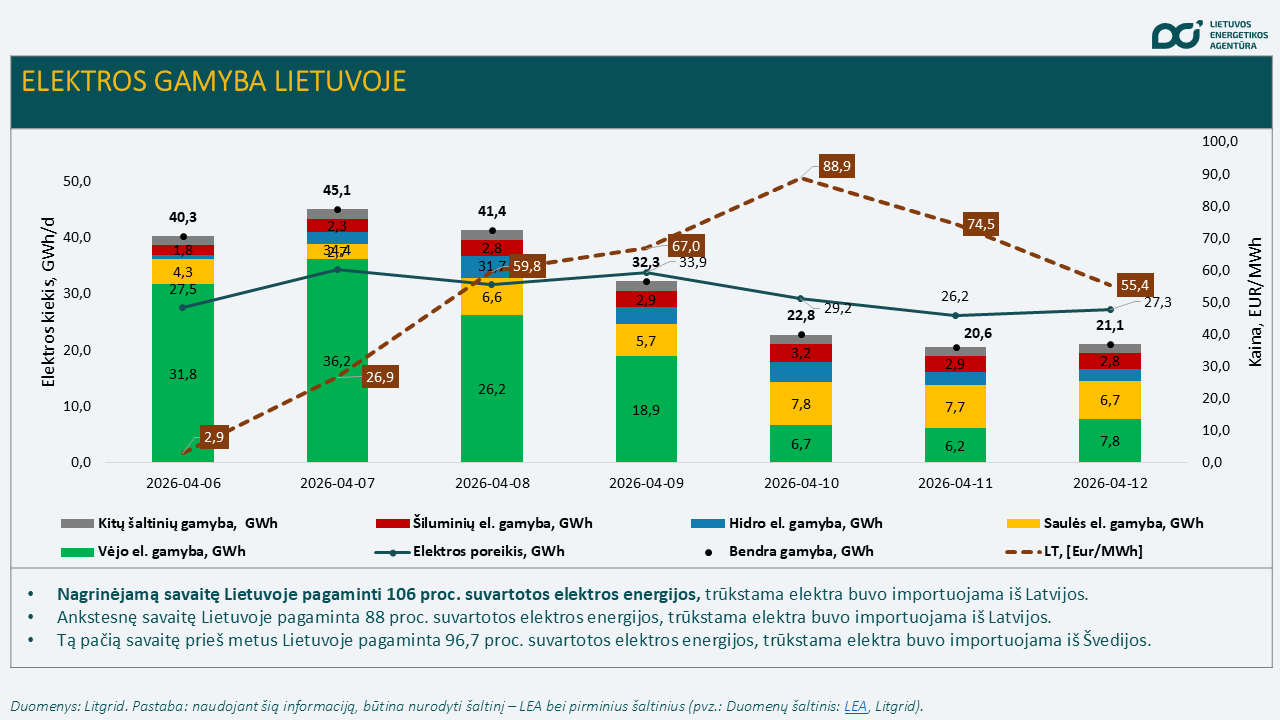 2026 04 13Elektros energijos kainų vidurkis Lietuvoje praėjusią savaitę sumažėjo 26 proc., išaugus vėjo elektrinių generacijai. Šalyje pasigaminta apie 106 proc. visos suvartotos elektros energijos. Gamtinių dujų kainų TTF vidurkis sumažėjo 4,1 proc. – iki 49,3 Eur/MWh, tikintis JAV ir Irano taikos. Brent naftos kainų savaitės vidurkis sumažėjo 8,3 proc., tačiau išliekanti aukšta naftos kaina lėmė, kad Lietuvoje per savaitę benzinas pabrango 0,9 proc., dyzelino vidutinė kaina išaugo 2,5 procento. Biokuro kainų mažėjimas sustojo – pirmą kartą pavasarį biokuras pabrango 3,6 proc. – iki 20,22 Eur/MWh.