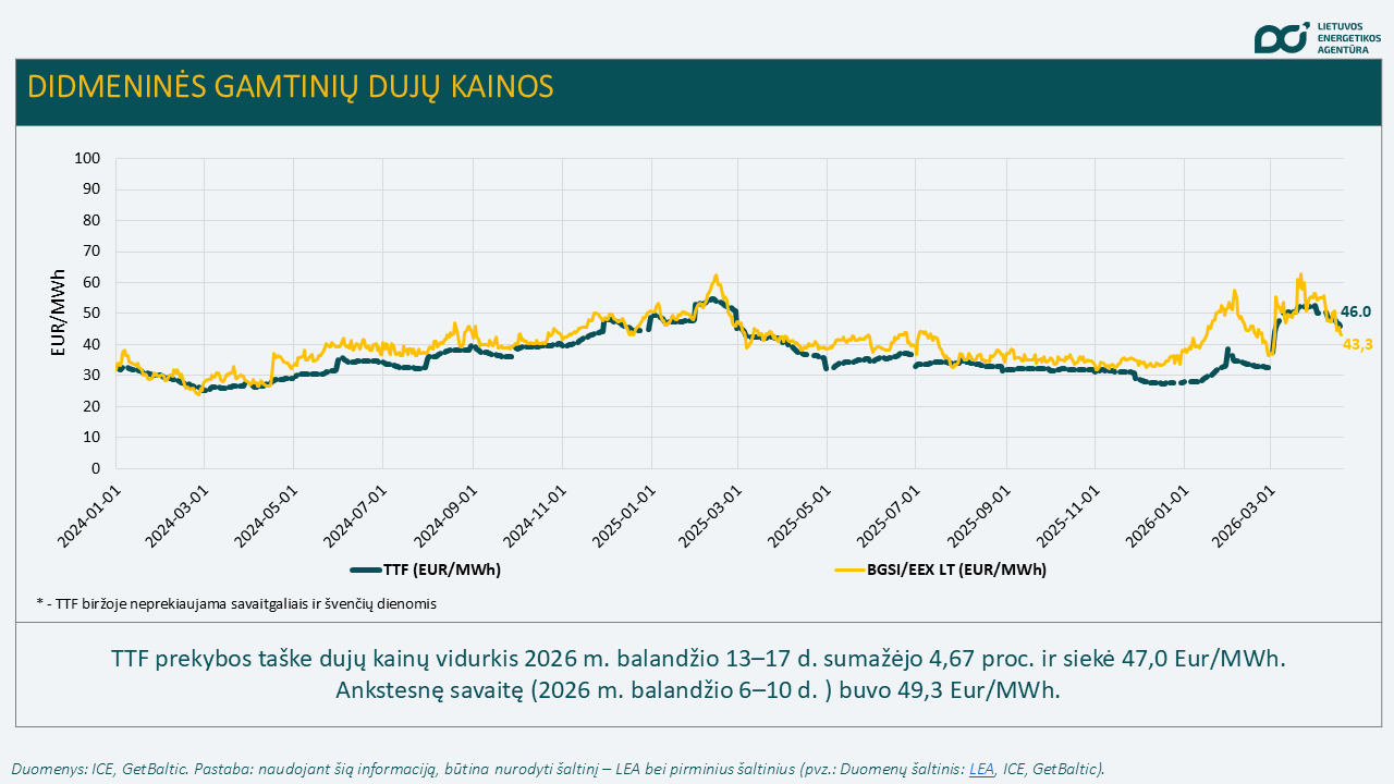 Vidutinė didmeninė dujų kaina Nyderlandų prekybos taške TTF balandžio 13–17 d. mažėjo 4,67 proc., o savaitės kainų vidurkis sudarė 47 Eur/MWh. Ankstesnę savaitę (balandžio 6–10 d.) buvo 49,3 Eur/MWh.