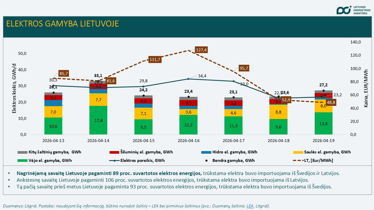 Bendra elektros gamyba per savaitę Lietuvoje, palyginti su ankstesne savaite (223,7 GWh), sumažėjo 19,2 proc. ir siekė 180,8 GWh. Šalyje pasigaminta apie 89 proc. visos suvartotos elektros energijos, ankstesnę savaitę – 106 procentai.