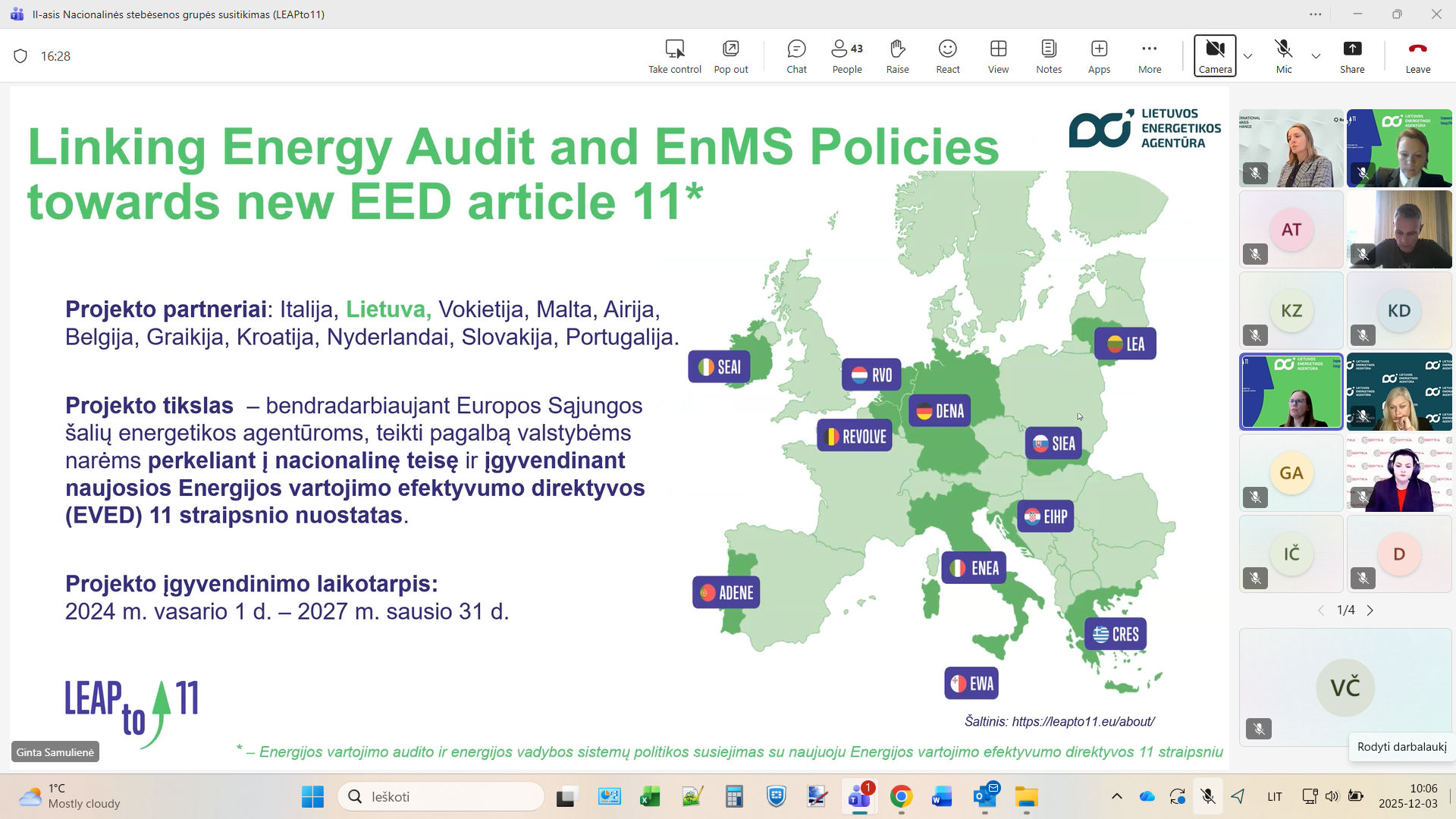 Lietuvos energetikos agentūra 2025 m. gruodžio 3 d. sukvietė Nacionalinės stebėsenos grupės, suburtos įgyvendinant projektą LEAPto11, narius į antrąjį susitikimą aptarti paramos priemones mažoms ir vidutinėms įmonėms, didinančioms energijos vartojimo efektyvumą. Prie susitikimo prisijungė daugiau kaip 40 įmonių ir valstybės institucijų atstovų, ekspertų. Svarbiausia aptarta tema – kas skatina įmones savanoriškai taupyti energiją? Ar pakankamos taikomos priemonės ir valstybės institucijų vaidmuo, skatinant įmones savanoriškai siekti energijos vartojimo efektyvumo?