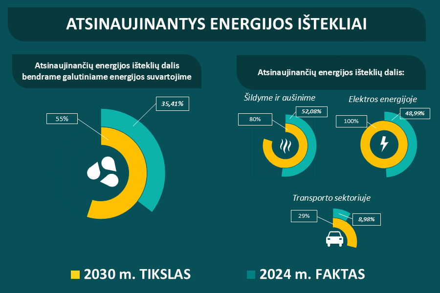2024 m. AEI dalis bendrame galutiniame energijos suvartojime sudarė 35,41 procento. Šiuos rezultatus daugiausia lėmė AEI dalis šilumos sektoriuje, kuri sudarė 52,08 proc., AEI dalis elektros energijos suvartojime sudarė 48,99 proc., o transporto sektoriuje – 8,98 procento.