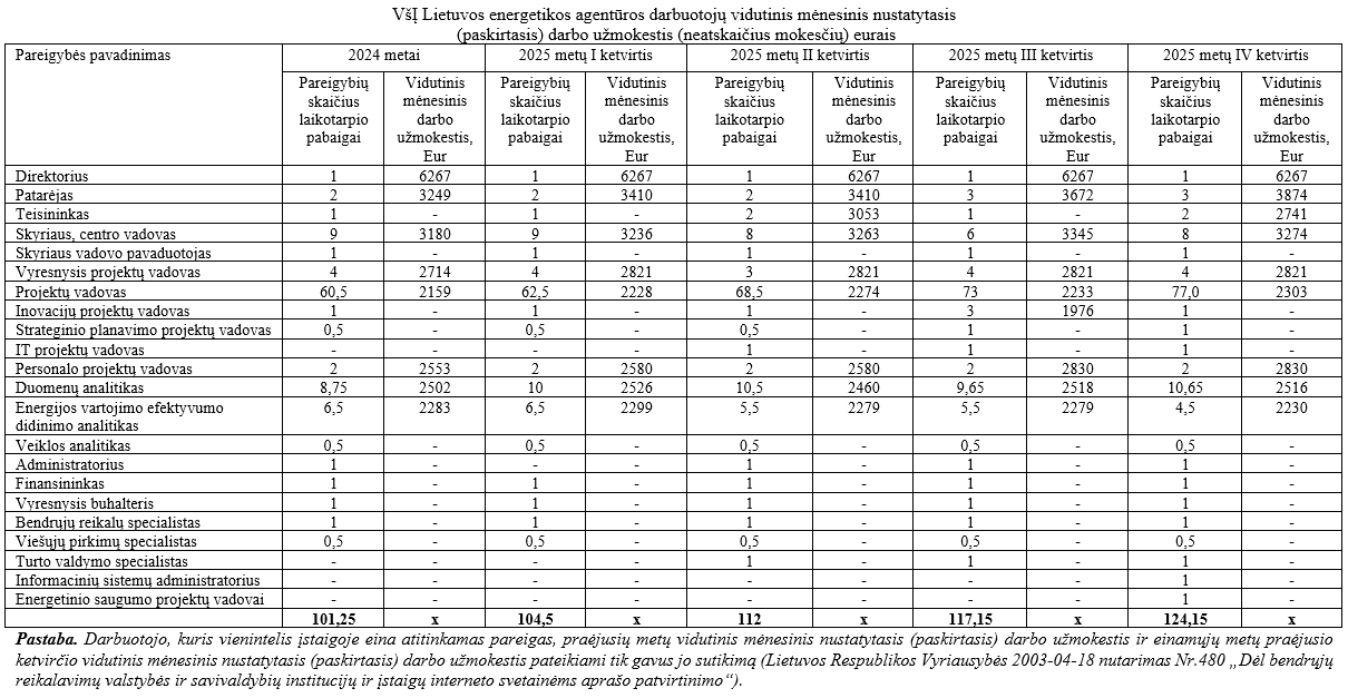 Viešosios įstaigos Lietuvos energetikos agentūros direktoriaus 2025 m. gruodžio 22 d. įsakymas Nr. V-89-(1.3 E) „Dėl viešosios įstaigos Lietuvos energetikos agentūros 2025 m. lapkričio 14 d. įsakymo Nr. V-76-(1.3E) „Dėl Viešosios įstaigos Lietuvos energetikos agentūros darbo apmokėjimo sistemos patvirtinimo“ pakeitimo“. |