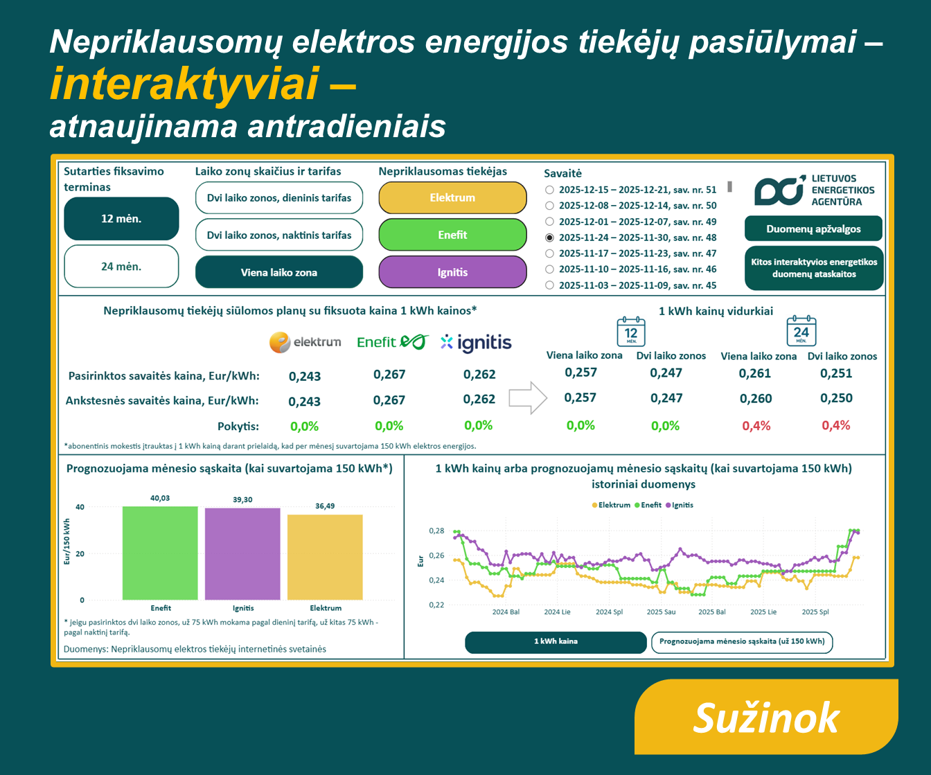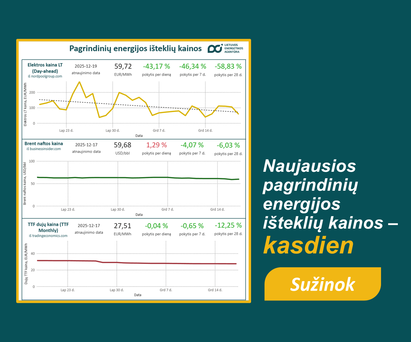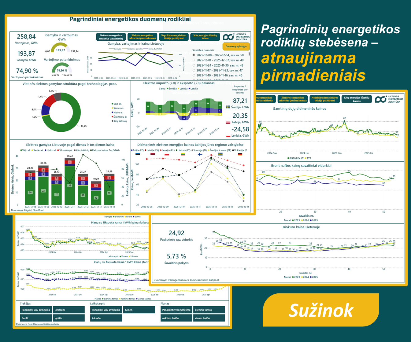 Viešoji įstaiga Lietuvos energetikos agentūra, vykdydama savo funkcijas ir pasitelkdama sukauptas ekspertines žinias bei patirtį, renka ir sistemina energetikos duomenis, atlieka jų analizę bei reguliariai skelbia energetikos duomenų rodiklius ir apžvalgas, apimančias įvairius energetikos sektorius ir jų analizę. Šiose apžvalgose pateikiama aktuali, analitinėmis įžvalgomis grįsta informacija apie elektros energetikos, gamtinių dujų, degalų ir naftos, kelių transporto, šilumos energijos ir biokuro sektorius bei kitų energetikos sričių raidą, padedanti geriau suprasti sektoriaus tendencijas, pokyčius ir jų kontekstą.