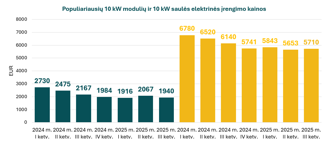 Vidutinė 10 kW galios saulės elektrinės įrengimo kaina, įskaitant saulės modulius, montavimo konstrukcijas, inverterius, valdymo įrangą, projektavimą ir kitas paslaugas, siekia 5 710 eurų. Nors modulių kainos mažėjo, bendra elektrinės kaina, palyginti su ankstesniu ketvirčiu, padidėjo apie 1 proc. – nuo 5 653 eurų.