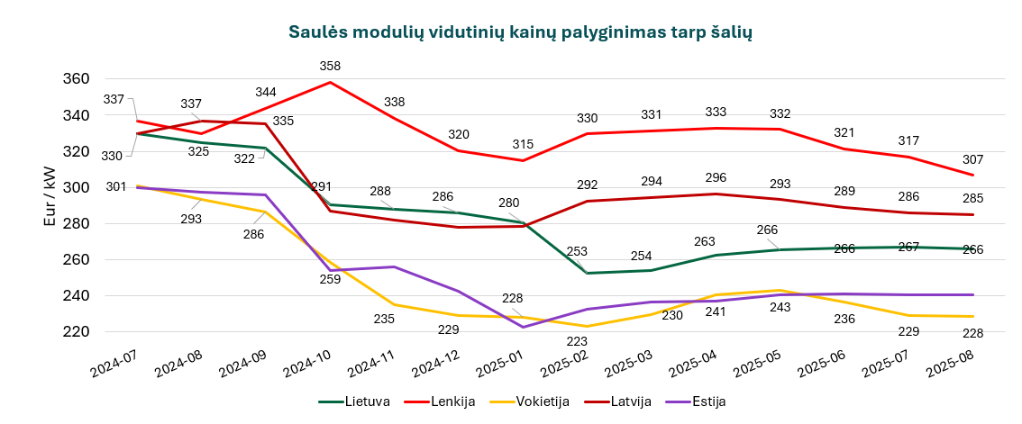 Analizuojant kitų šalių saulės modulių pardavėjų viešai skelbiamas analogiškų, t. y. tokio paties tipo ir galios diapazono, saulės modulių kainas Baltijos šalyse, Lenkijoje ir Vokietijoje, nustatyta, kad 2025 m. rugpjūtį, lyginant su liepa, Azijos gamintojų saulės modulių vidutinės kainos Lietuvoje ir Estijoje nesikeitė, Lenkijoje nežymiai sumažėjo (-0,2 proc.), o Vokietijoje ir Latvijoje pakilo Latvijoje (atitinkamai 0,2 ir 0,6 proc.).