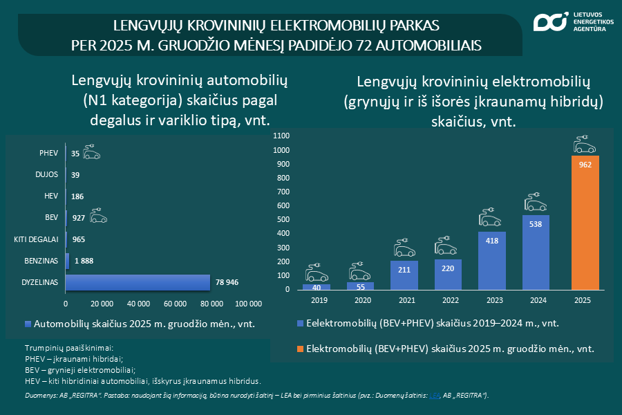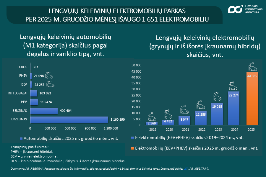 Lietuvos energetikos agentūros duomenimis, per 2025 m. gruodžio mėnesį Lietuvos kelių transporto priemonių registre įregistruota 1 763 lengvieji keleiviniai elektromobiliai (iš jų – 925 grynieji elektromobiliai ir 838 – iš išorės įkraunamų hibridų) – tai 7,3 proc. daugiau nei įregistruota per 2025 m. lapkričio mėnesį (įregistruoti 1 643 lengvieji keleiviniai elektromobiliai) ir 88,6 proc. daugiau, nei buvo įregistruota tuo metu prieš metus (per 2024 m. gruodį buvo įregistruota 935 lengvieji keleiviniai elektromobiliai). 2025 m. gruodžio mėnesį Lietuvoje įregistruotų grynųjų elektromobilių skaičius viršijo įkraunamų hibridų skaičių. Tokia tendencija buvo tik 2025 m. kovo, rugsėjo ir gruodžio mėnesiais.