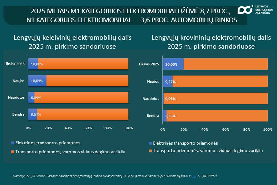 Lietuvos Respublikos alternatyviųjų degalų įstatyme nustatyta, kad iki 2025 m. gruodžio 31 d. M1 kategorijos elektromobilių skaičius turi sudaryti ne mažiau kaip 10 proc., o N1 kategorijos elektromobilių skaičius – ne mažiau kaip 20 proc. metinių pirkimų sandorių. Reiškia, kad 2025 m. nebuvo pasiekti įstatyme numatyti tikslai.